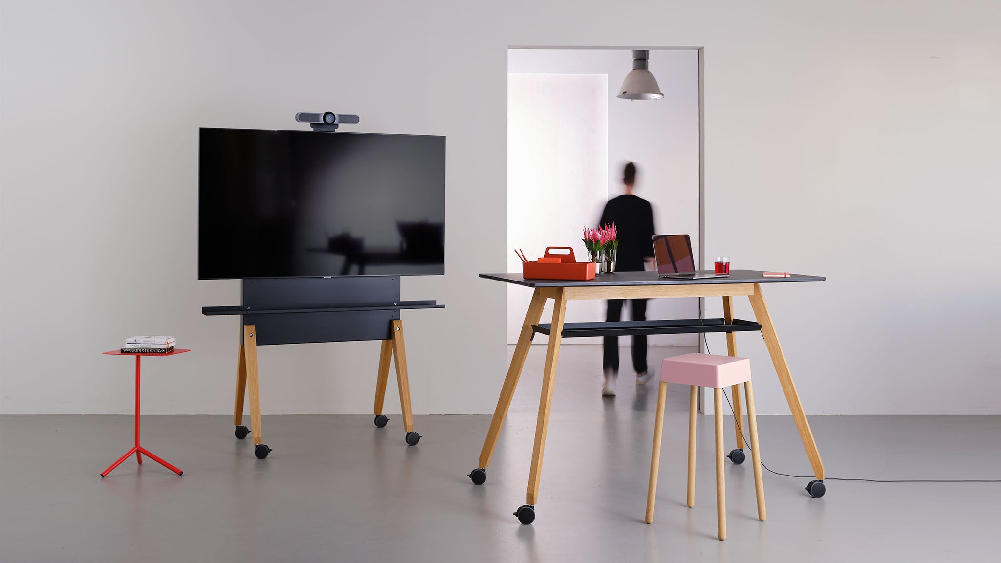 Unsere Monitorwägen bringen Technik elegant ins Spiel. Sie funktionieren perfekt mit Displays, Kameras und Konferenztechnik – ideal für Präsentationen, hybride Meetings oder Schulungen. Flexibel, stabil und mit einer Formsprache, die Technik integriert statt hervorhebt.