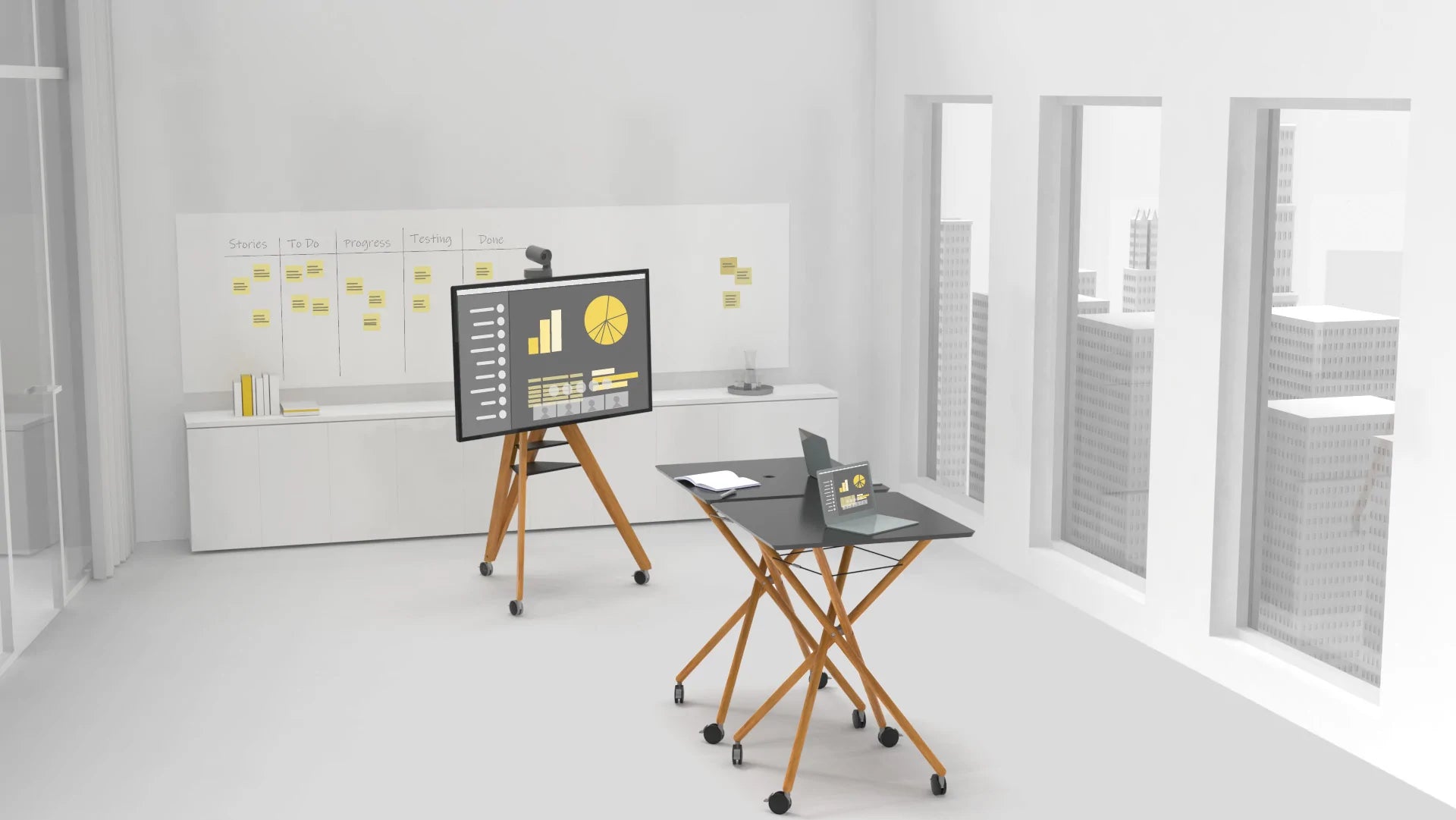 Meetings or discussions between teams often arise spontaneously, leaving employees with the problem that no free meeting room is available. Our flexible tools on <tc>Castors</tc> They can help here - simply rolled into the team office, they are immediately available and prevent frustration in the team.
