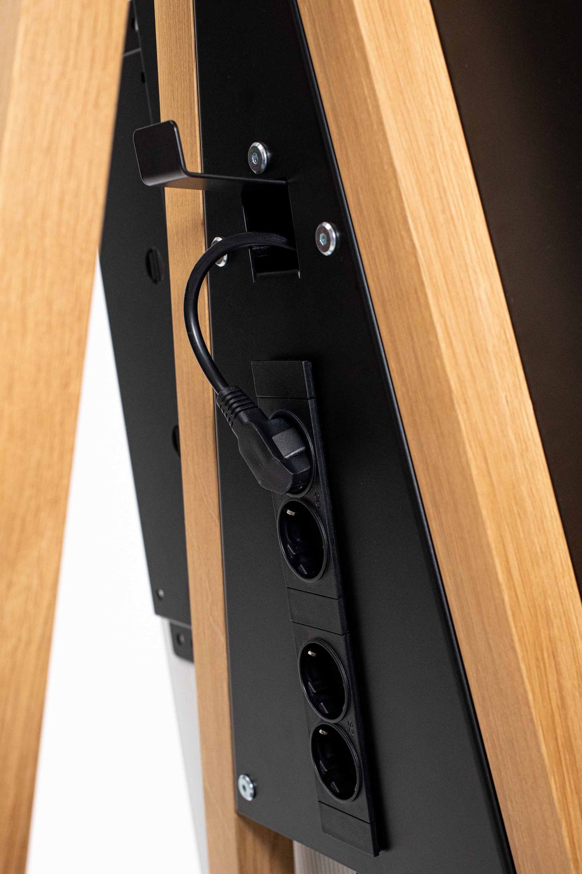 - Alimentation électriqueUne multiprise quatre prises intégrée à l'arrière offre un espace suffisant pour brancher des appareils tels qu'un ordinateur portable, une tablette ou des accessoires de visioconférence. Nous adaptons systématiquement le type d'alimentation au pays de livraison, afin que vous disposiez toujours des connexions adéquates sur votre Flip It en Suisse, en Italie, en France et au Royaume-Uni.