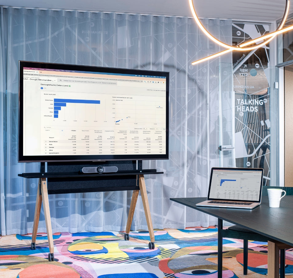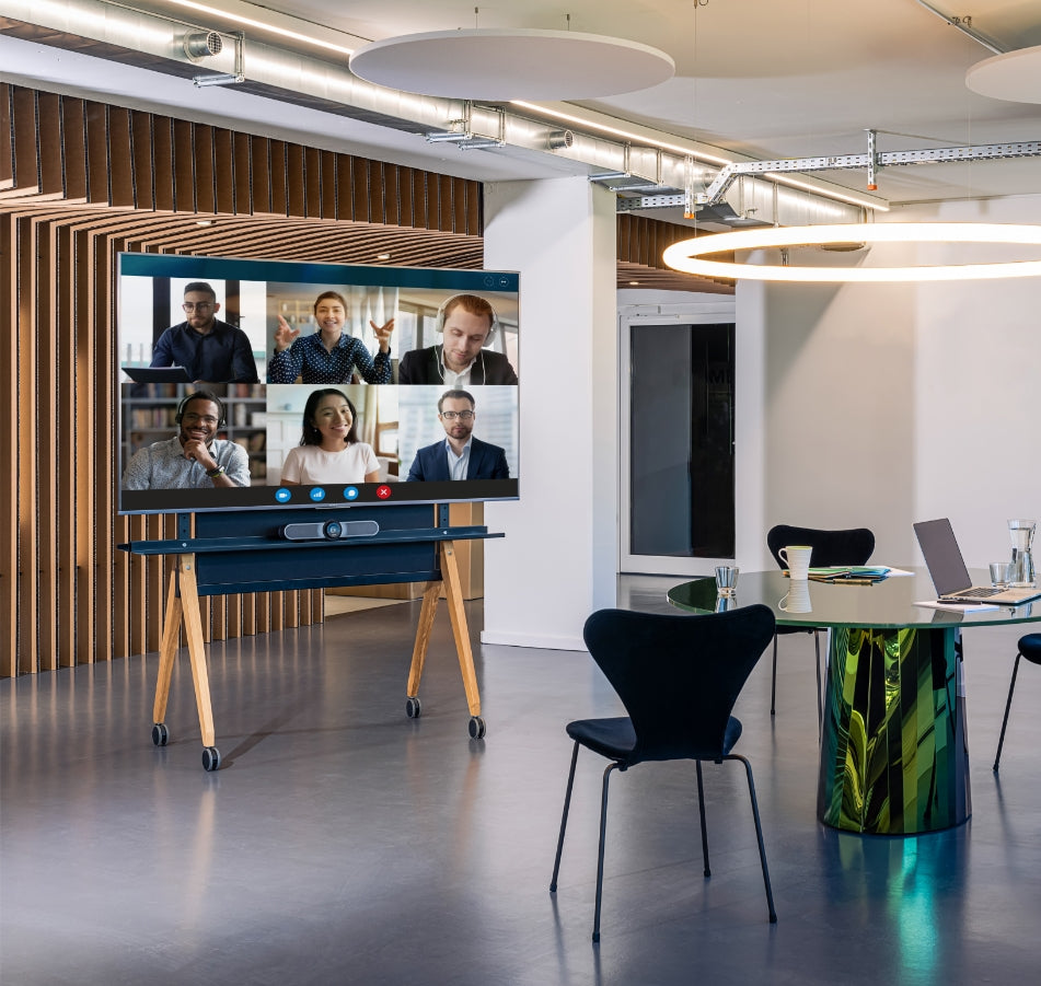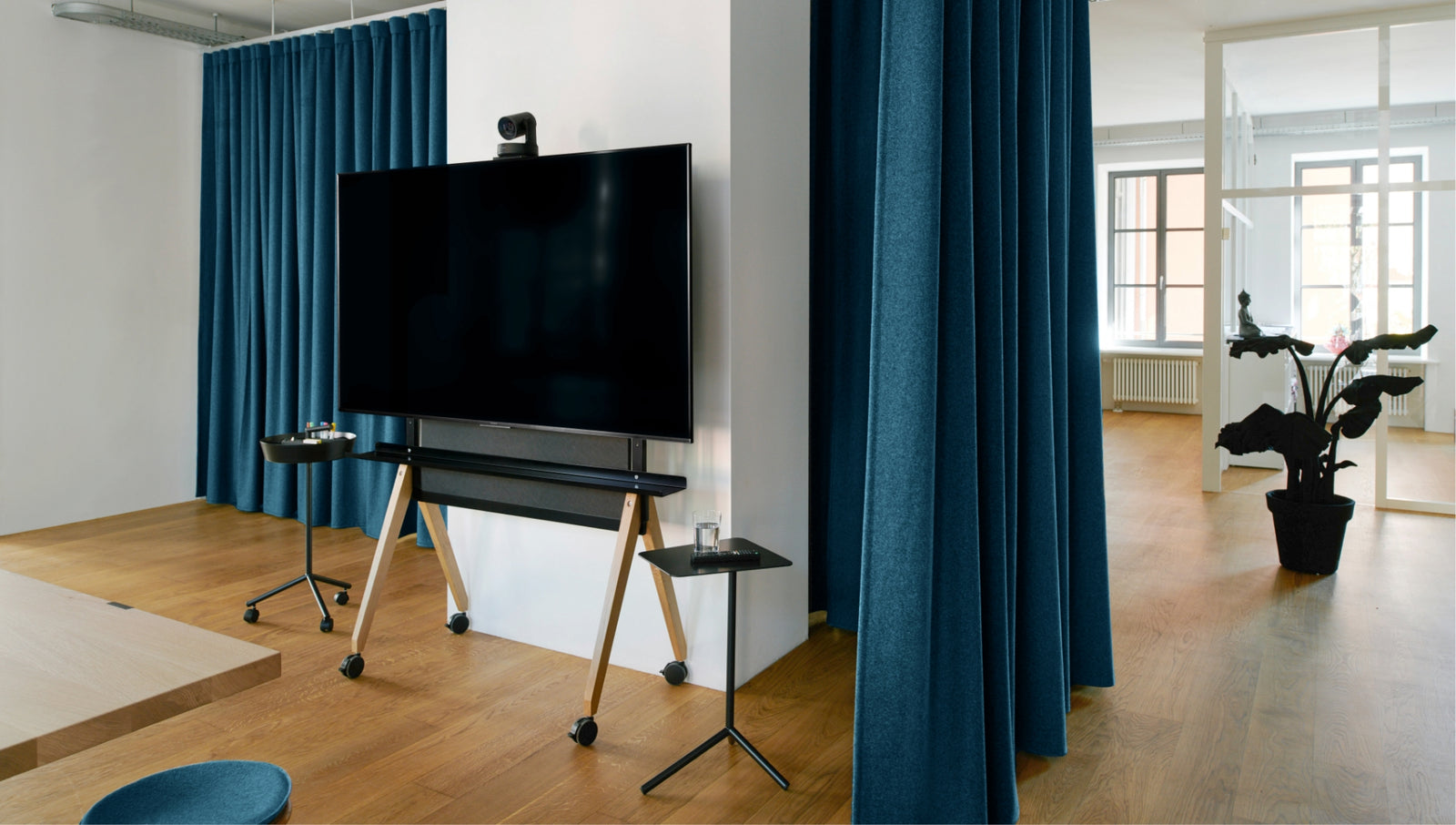 Il supporto TV Line Up è la nostra soluzione per monitor e touchscreen di grandi dimensioni fino a 85 pollici e con un peso fino a 60 kg, utilizzabile anche con una soluzione video per riunioni di team virtuali.